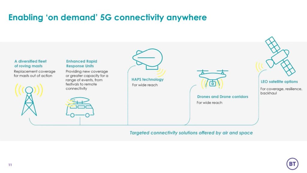 Portable cells will provide temporary mobile connectivity for customers when they request it, at a lower cost than building traditional cell sites and a fleet of rapid response vehicles will also be expanded and diversified to provide enhanced coverage, resilience or capacity in remote areas. BT is also targeting the greater use of air and space technologies, including drones and Low Earth Orbit satellites, and last month signed an early agreement with OneWeb to drive the technology applications forward.