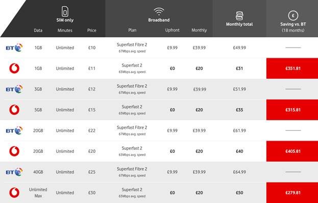 New Vodafone Together plans start from just £31 a month for a combined 18 month SIM-Only and home broadband plan. Customers can save up to £400 compared to BT over an 18 month period**. Vodafone Together is also available on all pay monthly plans.