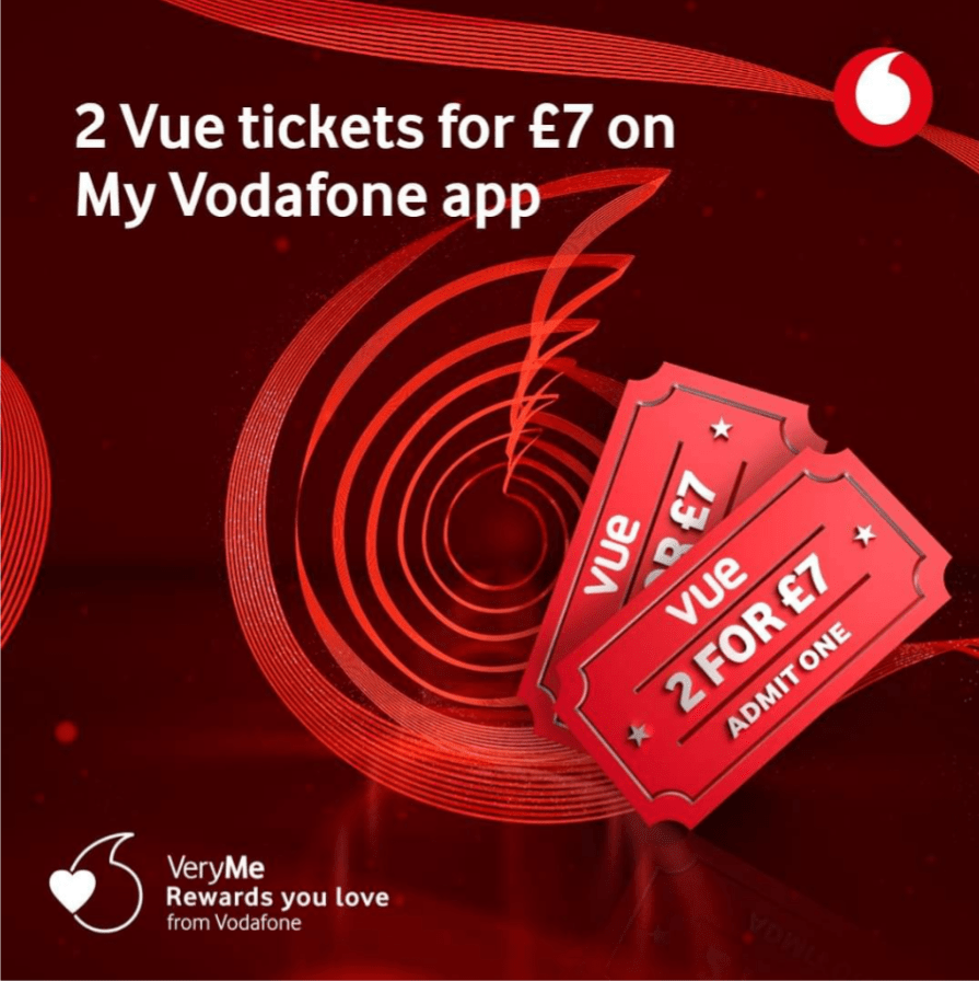 Vodafone is offering customers two cinema tickets for £7 as part of its VeryMe Rewards. To redeem this offer, customers simply open the My Vodafone app, click on ‘VeryMe Rewards’ and claim the offer. Customers can claim once per week, every week.