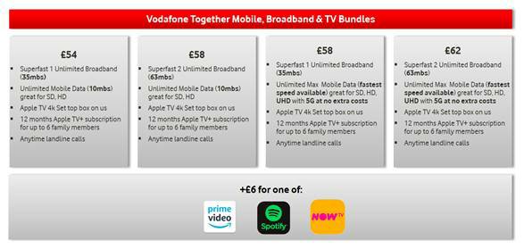 · Vodafone Together now with unlimited broadband, unlimited mobile data and Apple TV 4K from as little as £54 a month