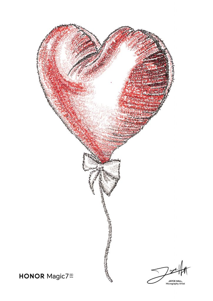 Created to celebrate the extraordinary zoom capabilities of the new Magic7 Pro, the clever design, was lovingly crafted in partnership with internationally renowned micrography artist, Jayce Hall, who creates incredible illustrations of A-listers, animals and landscapes – only using the written word. Some of Hall’s most iconic pieces, depicted from thousands of handwritten tiny words, include portraits of The Beatles, Wicked’s Elphaba and Glinda and even Taylor Swift’s boyfriend and NFL player Travis Kelce.